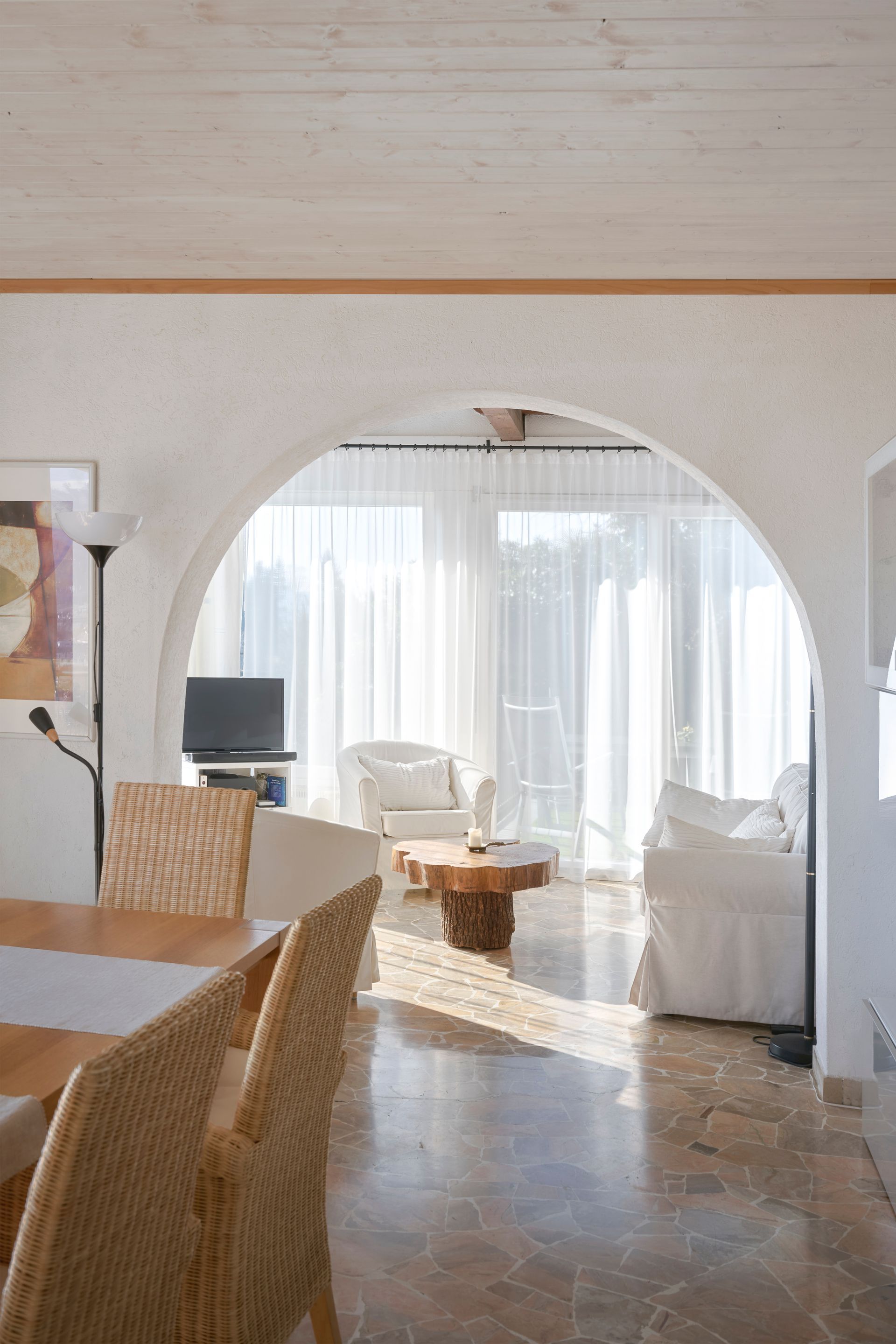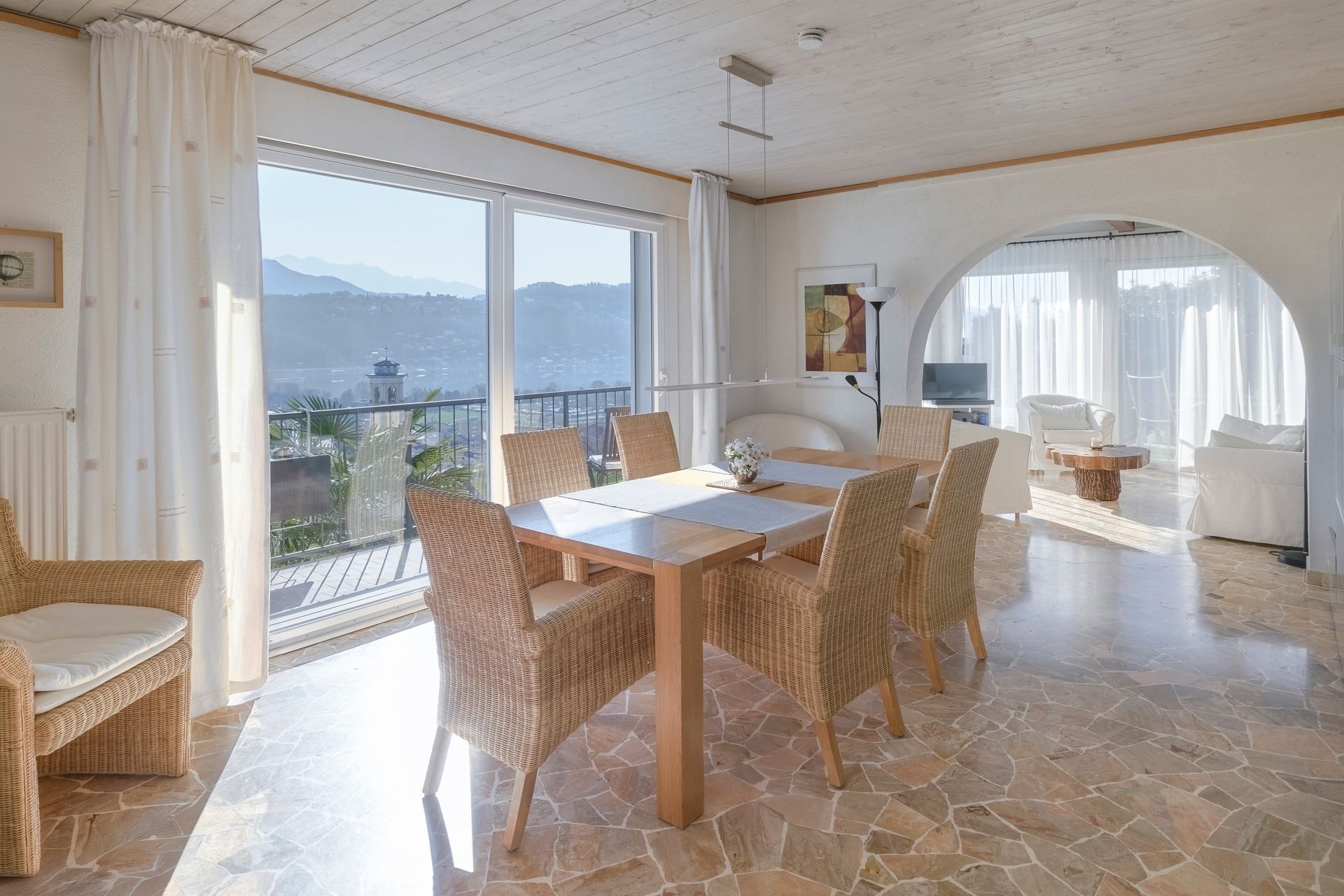 Das Obergeschoss öffnet sich zu einem einladenden Wohnbereich, in dem der Esstisch und das gemütliche Wohnzimmer mit einem atemberaubenden Blick auf den Luganersee begeistern.