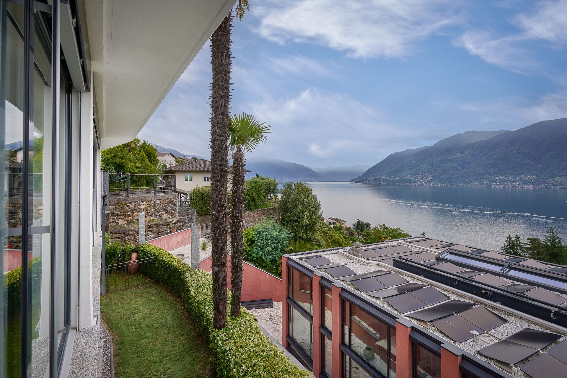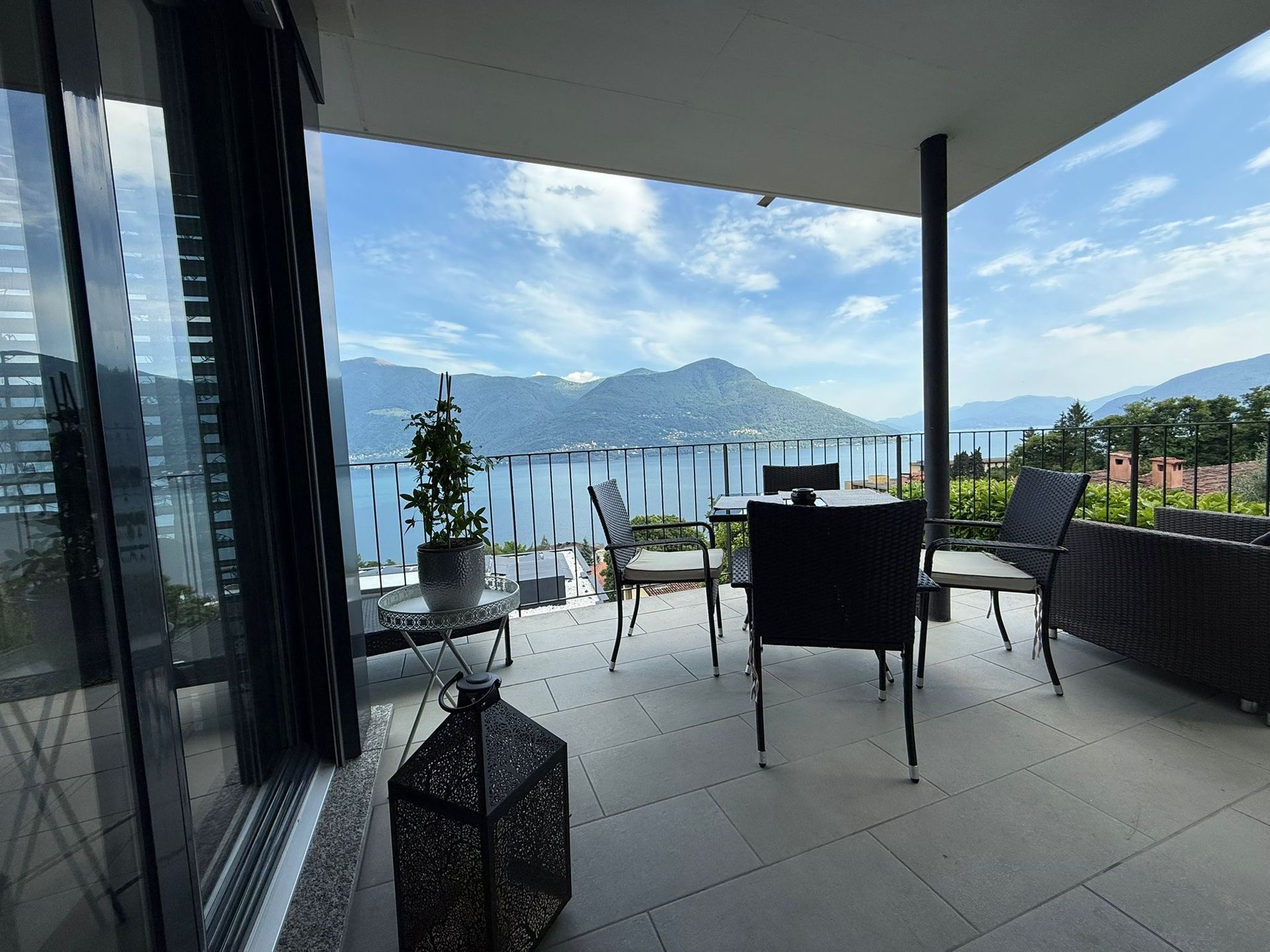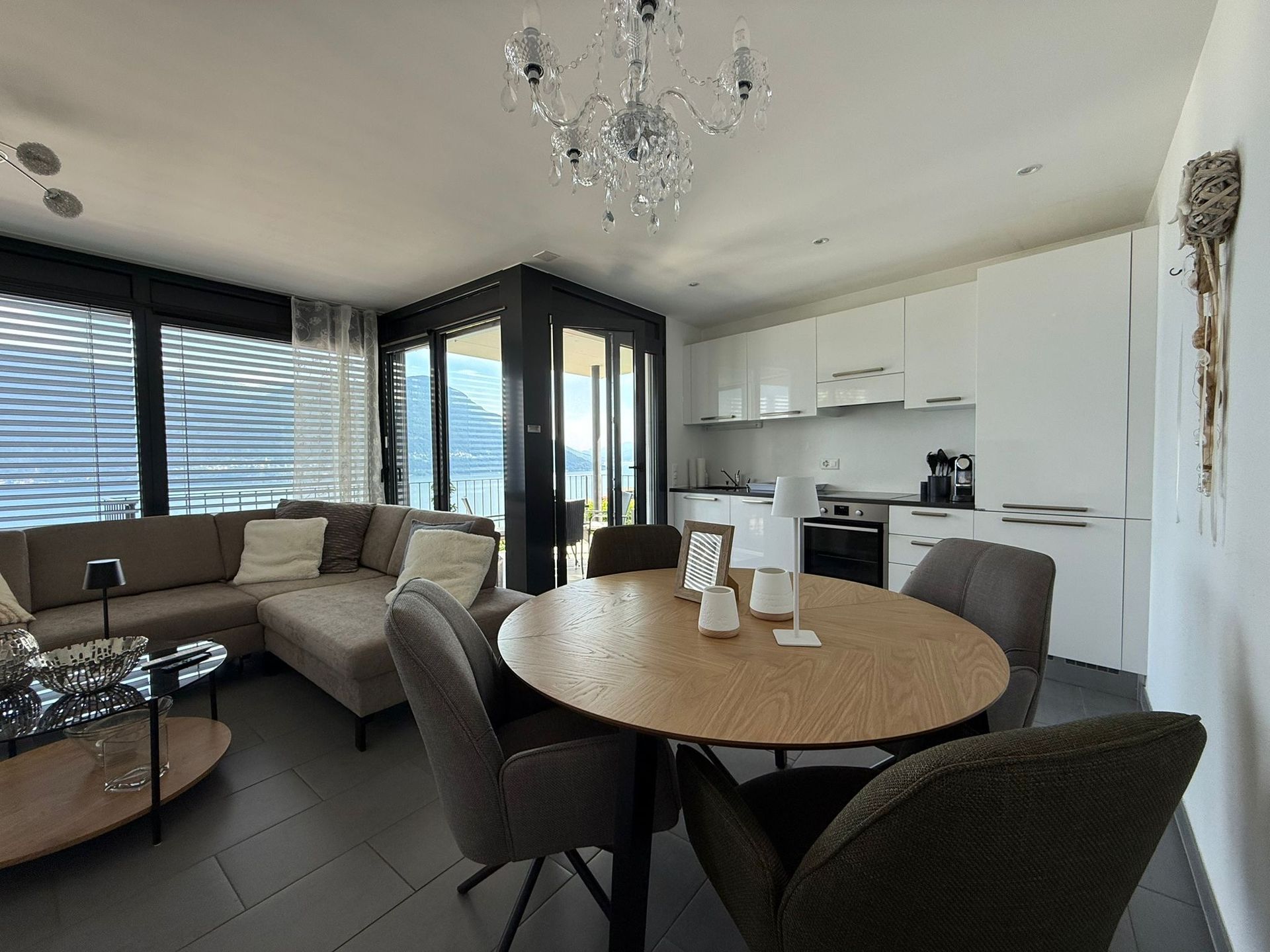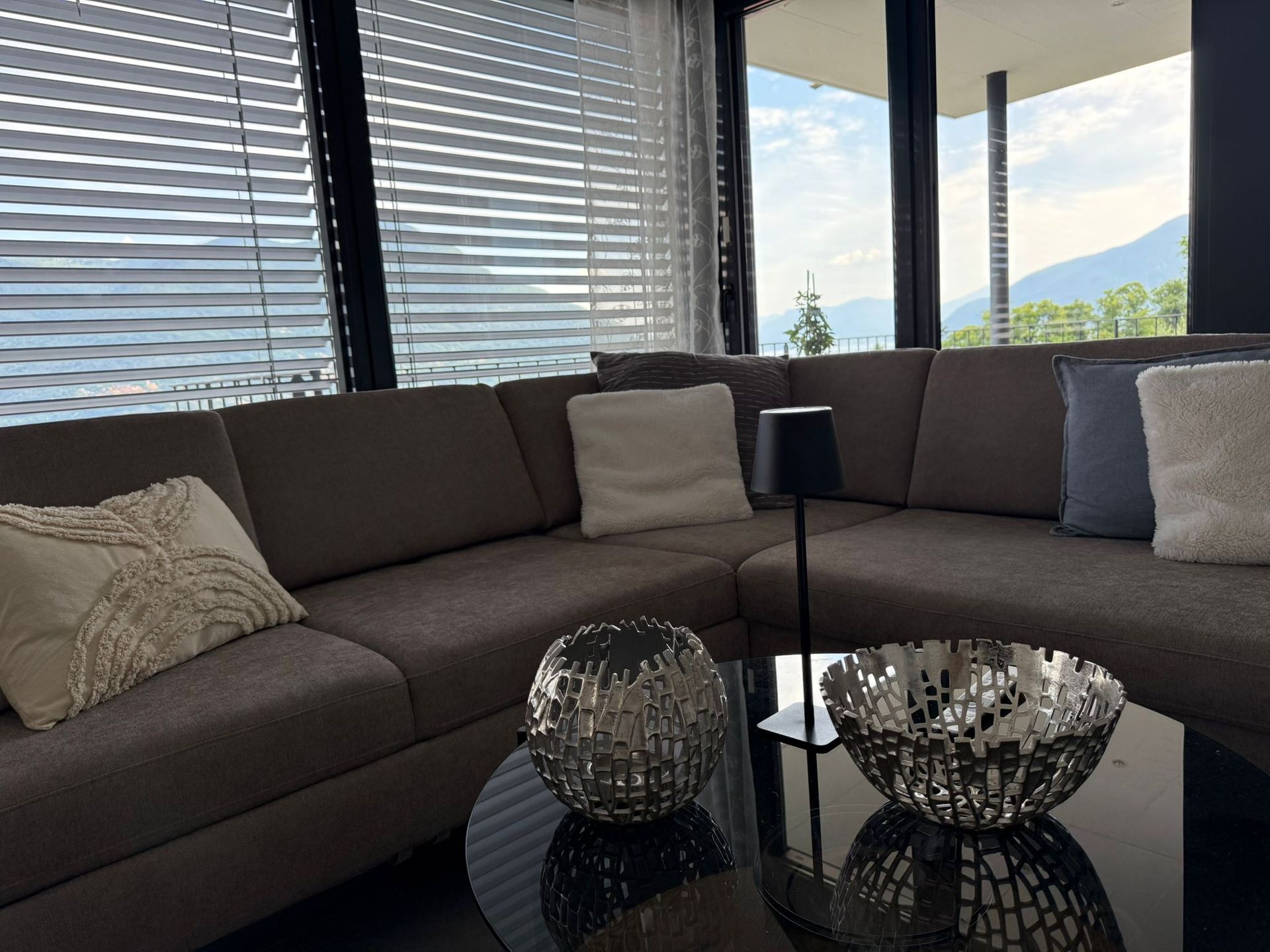 Egal, wo Sie sich in diesem elegant in Beige und Schwarz gestalteten Appartement befinden – ob Sie in der offenen Küche das Essen zubereiten, am Esstisch ein Glas Tessiner Wein genießen, den Abend in der anschließenden Sofaecke ausklingen lassen oder sich in eines der beiden Schlafzimmer zurückziehen – Sie haben immer einen atemberaubenden Blick auf den See und das gegenüberliegende Bergpanorama. Große bodentiefe Fenster gewähren Ihnen einmalige Ausblicke – aus jeder Perspektive. Und was gibt es Schöneres, als am nächsten Morgen auf der lichtdurchfluteten Terrasse in bequemen Rattan-Stühlen den Tag zu begrüßen.