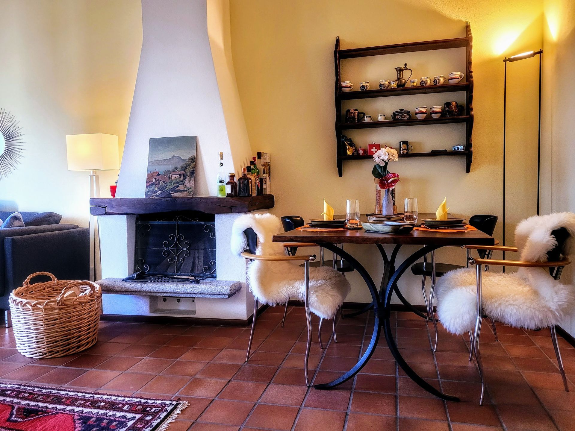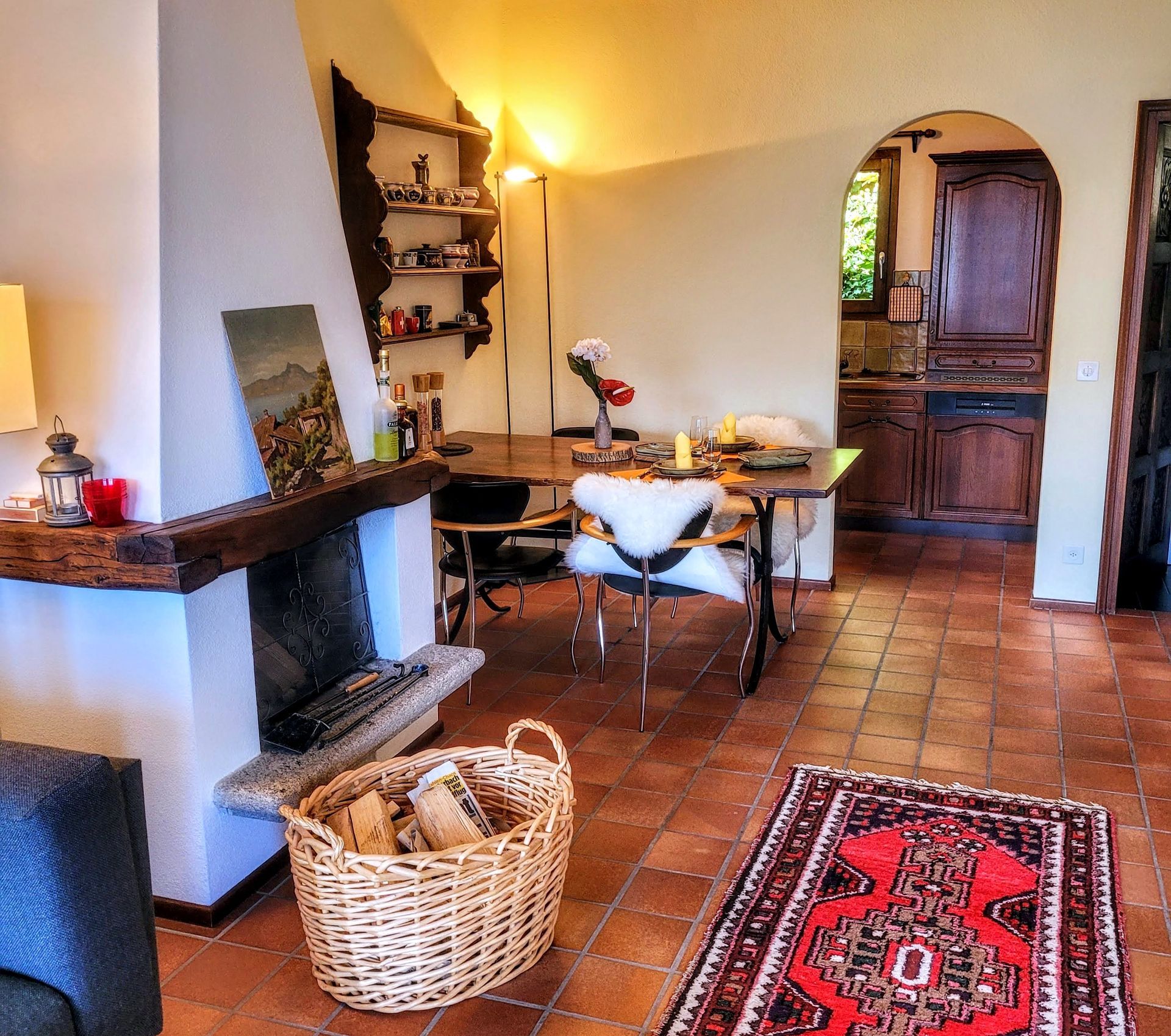 Über ein paar Stufen erreichen Sie die obere Ebene, wo Sie ein schön geschnittenes Wohnzimmer mit Essbereich sowie eine gut ausgestattete Küchenzeile sowie ein modernes Gäste-WC erwarten. Der großzügige Wohnraum überzeugt mit Tessiner Charme aufgrund der hohen Decke mit Holzbalken sowie einem offenen Kamin.